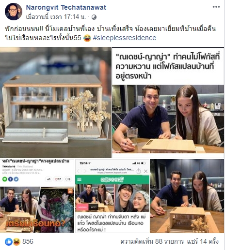 แต่ล่าสุด “หนึ่ง ณรงค์วิทย์” นักร้องนักแต่งเพลงชื่อดัง ได้ออกมา ดับฝันเหล่าบรรดาแฟนคลับ NY ไปเป็นที่เรียบร้อย โดยออกมาเปิดเผยว่า เป็นโมเดลบ้านของตนเอง พร้อมกับโพสต์ข้อความแซวว่า “พักก่อนนนน!! นี่โมเดลบ้านพี่เอง บ้านเพิ่งเสร็จ น้องเลยมาเยี่ยมที่บ้านเมื่อคืน ไม่ใช่เรือนหออะไรทั้งนั้น55 #sleeplessresidence” เลยทำให้แฟนๆ เฮเกอร์กันยกใหญ่เลย เฮ้อออออออ