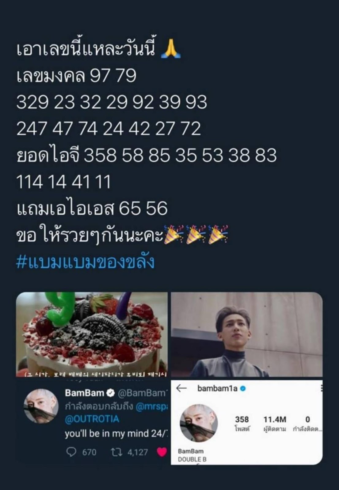 ดาราหนุ่มสุดฮอตที่ไปดังถึงต่างประเทศ หนุ่มแบมแบม GOT7 ขลังไม่หยุด ให้เลขเด็ด แฟนคลับ ถูกรางวัลเลขท้าย 2 ตัวกันทั่วหน้า งวดต่อไปต้องตาม